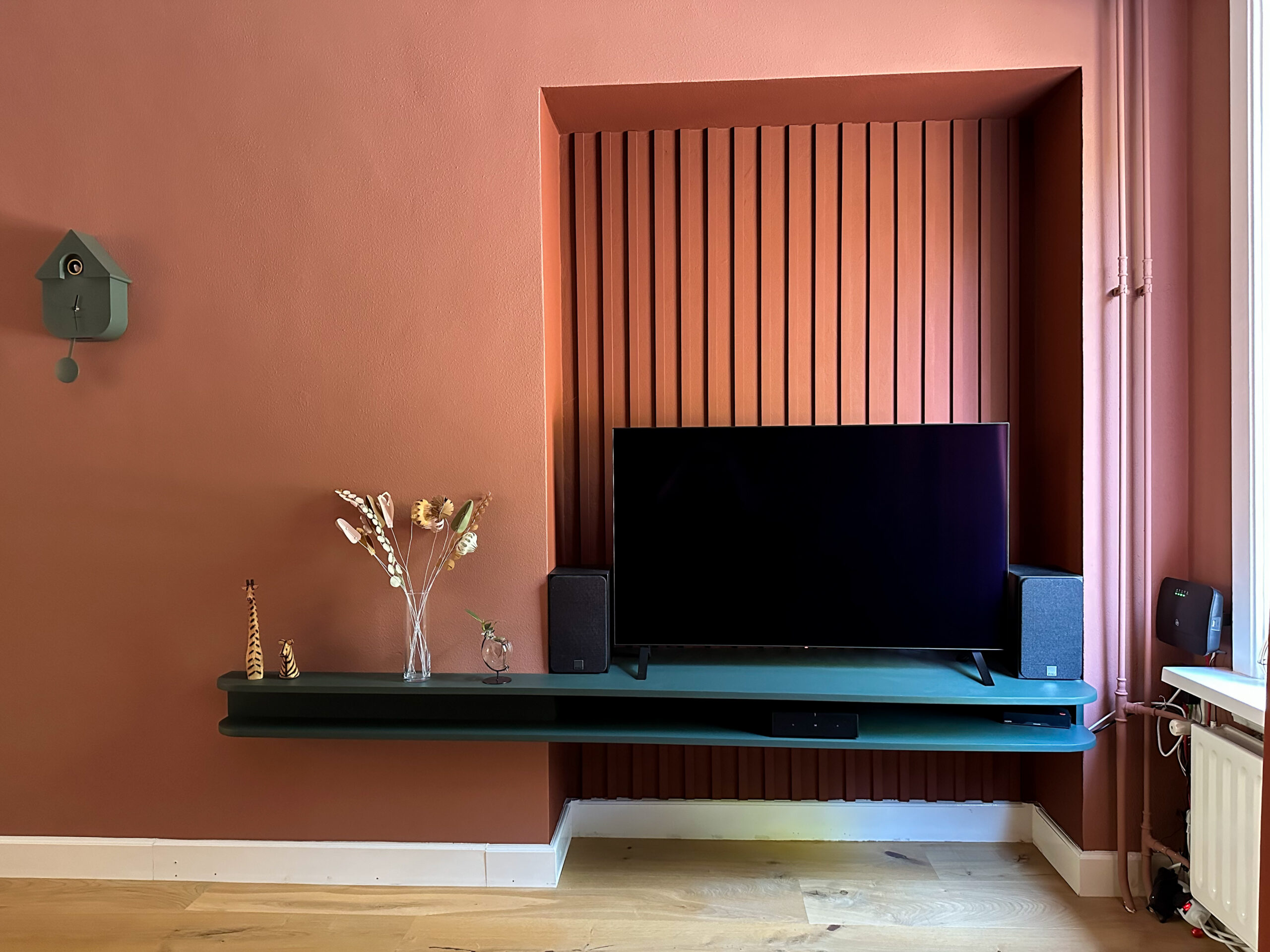 Daarnaast is er in de woonkamer gewerkt met een speelse verticale streep, wat zorgt voor een verrassend effect en extra dynamiek in het interieur. Door te werken met een vast kleurenpalet en dit door te trekken door het hele huis, is er een gevoel van rust en eenheid gecreëerd. Contrasterende kleuren, zoals roze en groen, zorgen voor een fris en levendig accent, zonder afbreuk te doen aan de warme sfeer van het geheel.